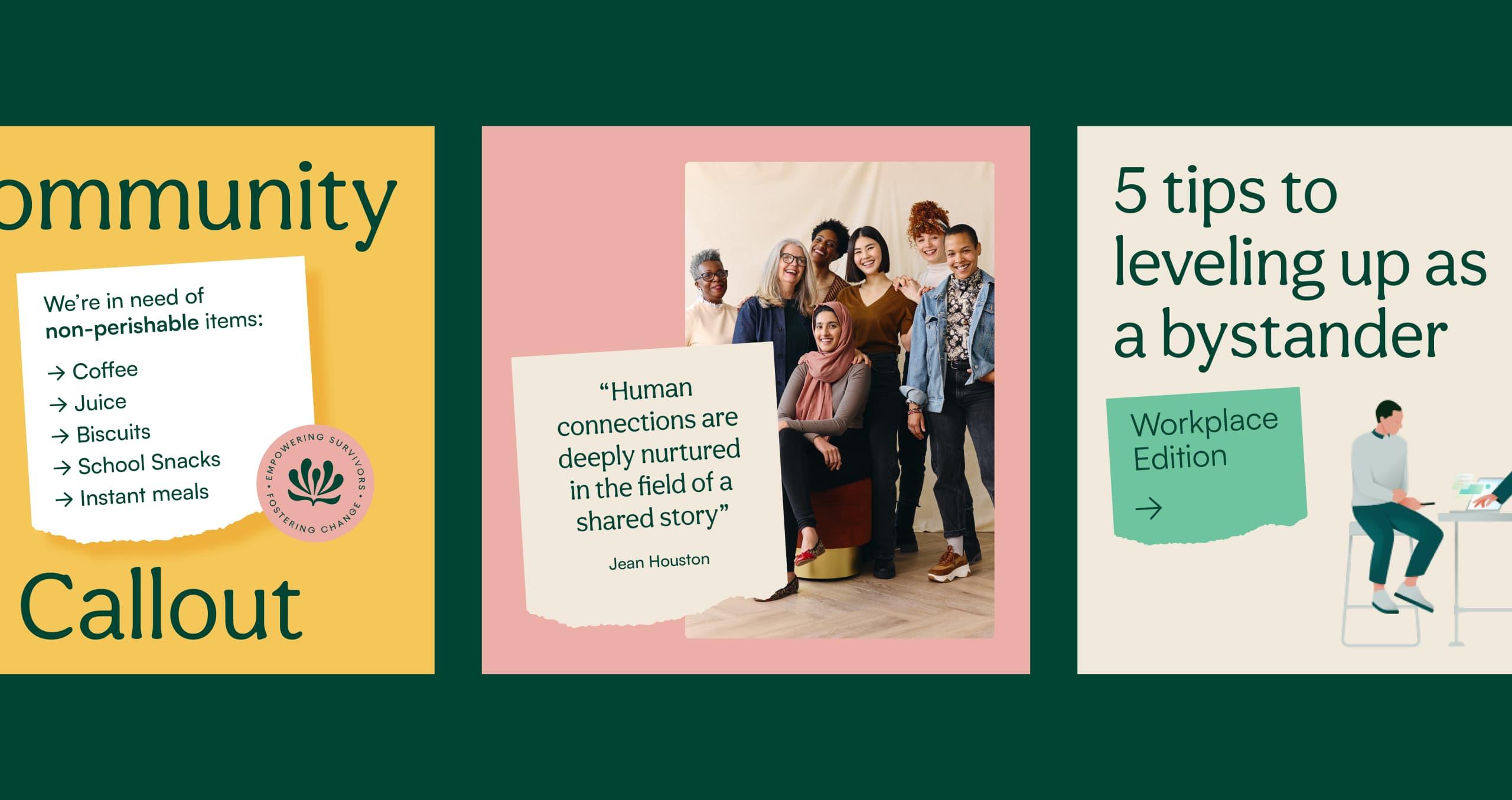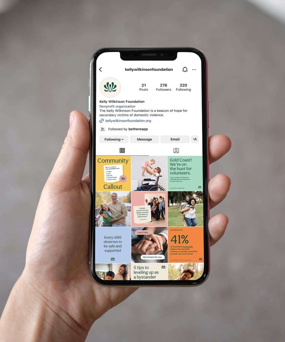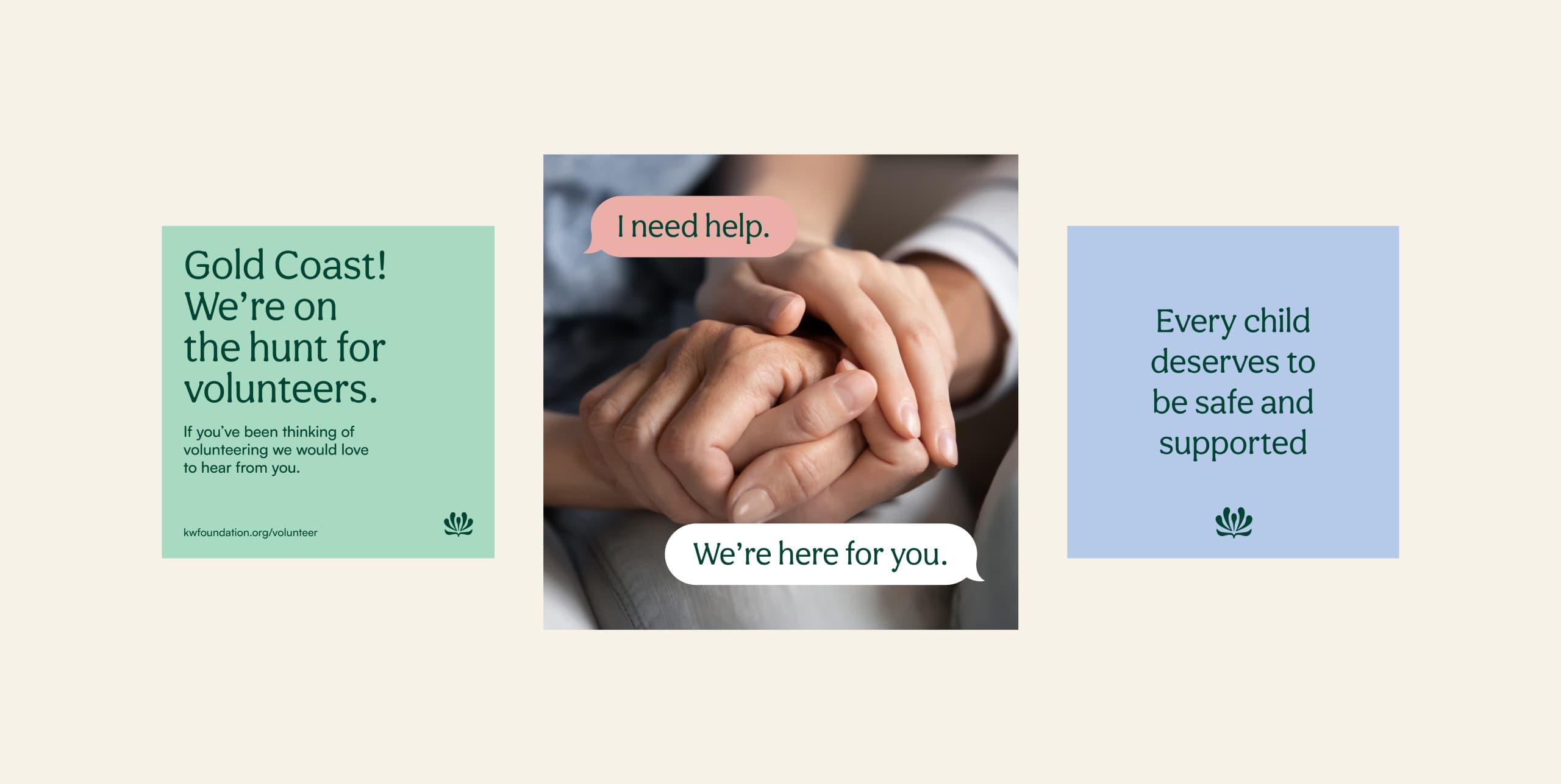The colour palette for the Kelly Wilkinson Foundation is a carefully curated spectrum that breathes life into the visual identity. Grounded in the steadfast resilience of deep green, the primary colour, and accentuated by the purity of off-white, the palette creates a foundation of strength and safety. The secondary palette introduces a vibrant array—teal, a symbol of support and healing; pink, representing compassion; yellow, embodying hope; orange, radiating warmth; and light blue, offering a calming presence. As a result the colour palette becomes more than a visual choice; it becomes an integral part of the narrative, expressing the essence and commitment of the Foundation.